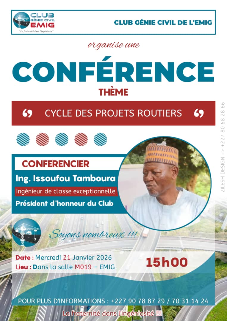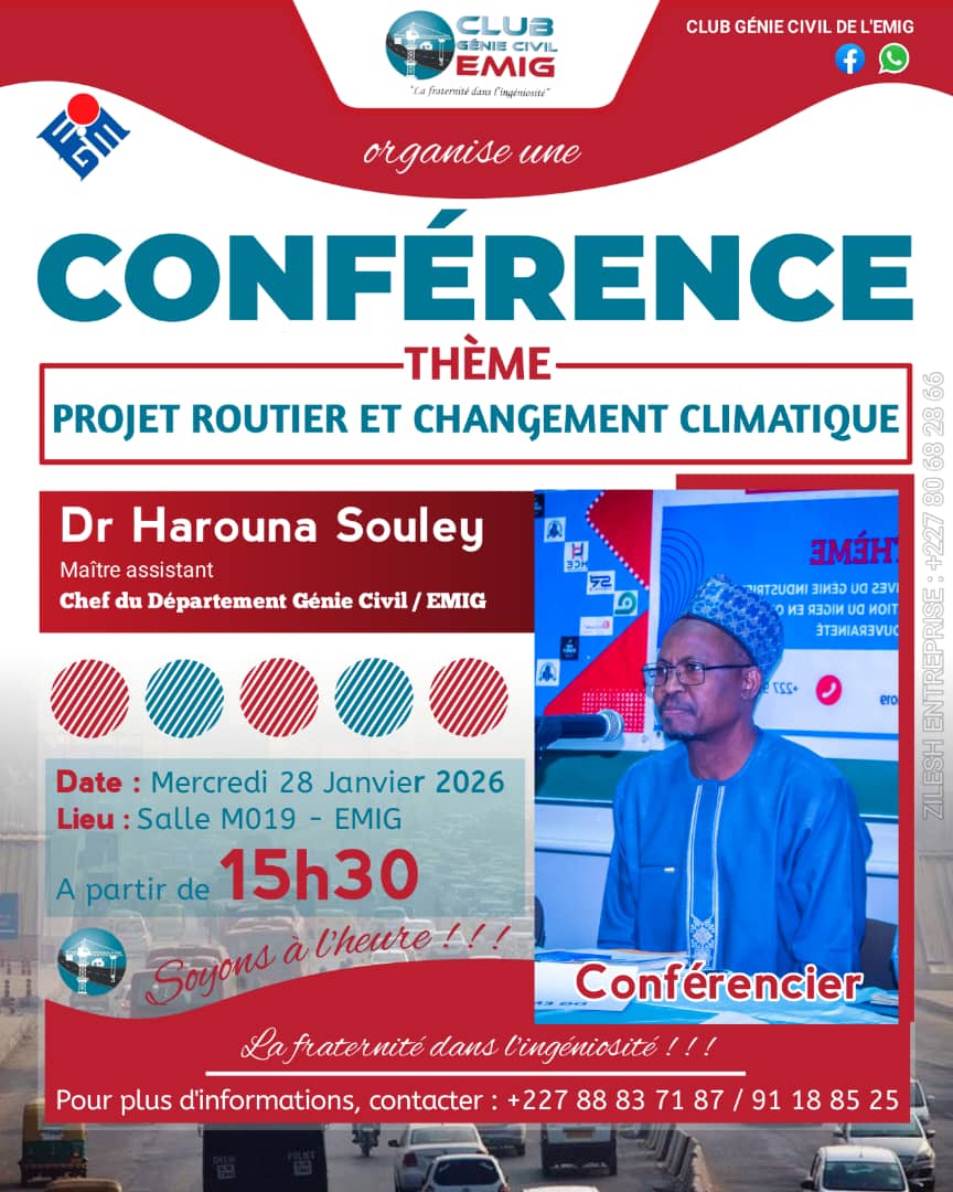 A l'occasion de cette grande conférence organisée par le club génie civil de l'EMIG, votre participation massive est vivement souhaitée. RDV : Ce Me...