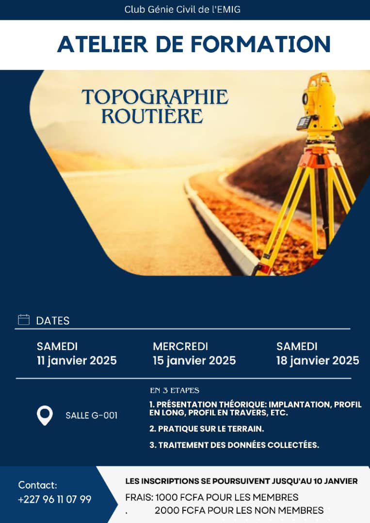 Le Club Génie Civil de l’EMIG organise un atelier de formation sur la topographie routière pour renforcer les compétences des participants à travers u...